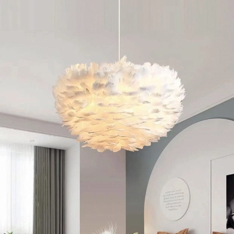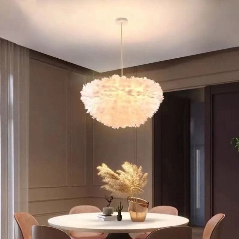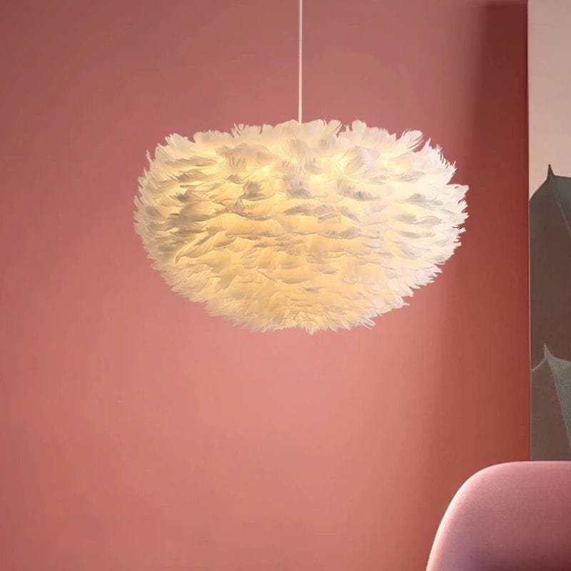 Denna fjäderklädda taklampa ger en mjuk och behaglig belysning som skapar en varm och inbjudande atmosfär i ditt hem. Dess fluffiga design i vitt ger rummet en lätt och elegant känsla, perfekt för vardagsrum, sovrum eller barnrum. Lampan är både en stilren inredningsdetalj och en funktionell ljuskälla som sprider ett dämpat och jämnt ljus.