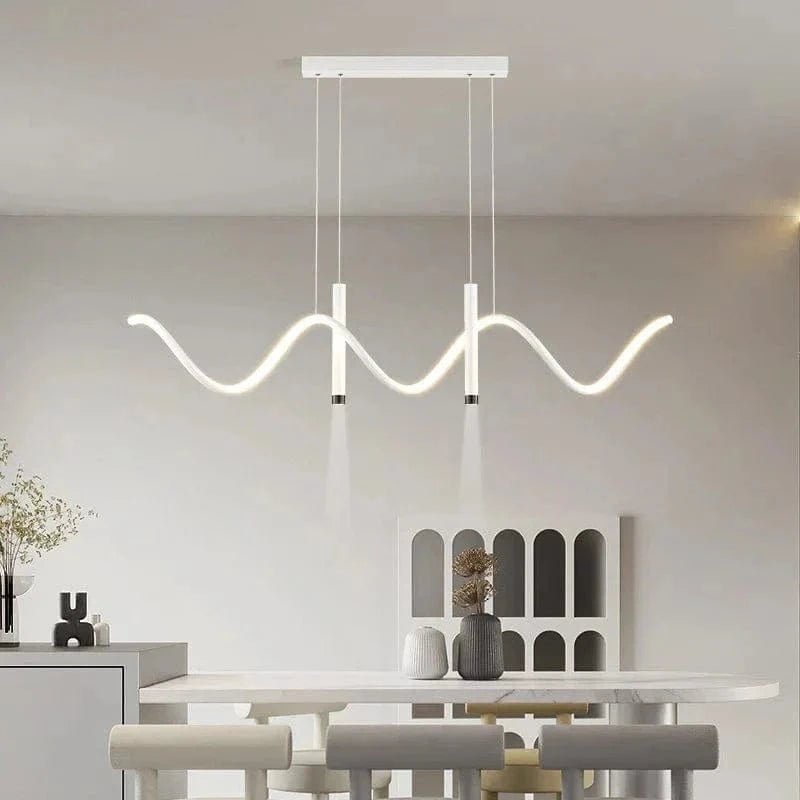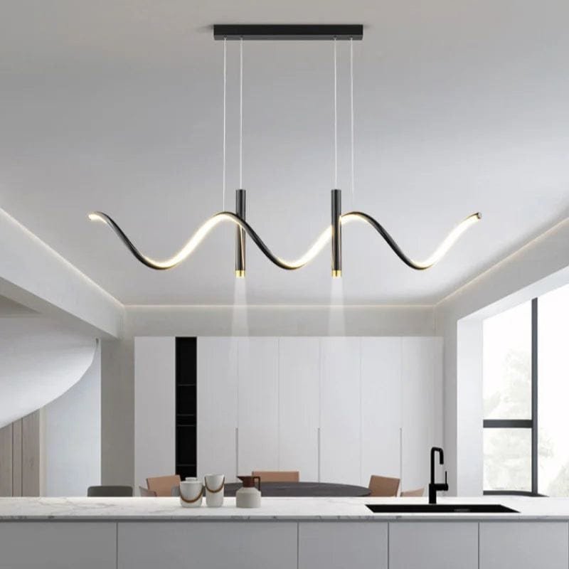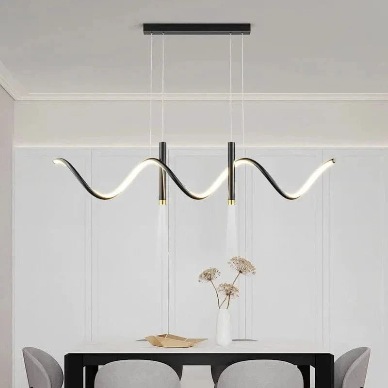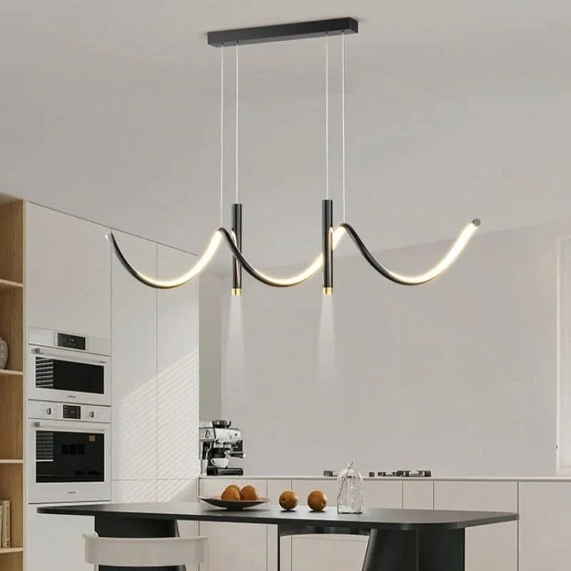 Denna imponerande taklampa kombinerar modern design med lyxiga mässingsdetaljer för att skapa en stilfull och funktionell ljuskälla. Med sin böljande LED-struktur och minimalistiska svarta metallram blir den ett konstnärligt inslag över matbordet, köksön eller i vardagsrummet. De integrerade LED-ljusen ger ett varmt, jämnt sken och bidrar till en behaglig atmosfär, samtidigt som de nedåtriktade spotlightsen ger fokuserad belysning. Den justerbara höjden gör det enkelt att anpassa lampan efter rummets behov.