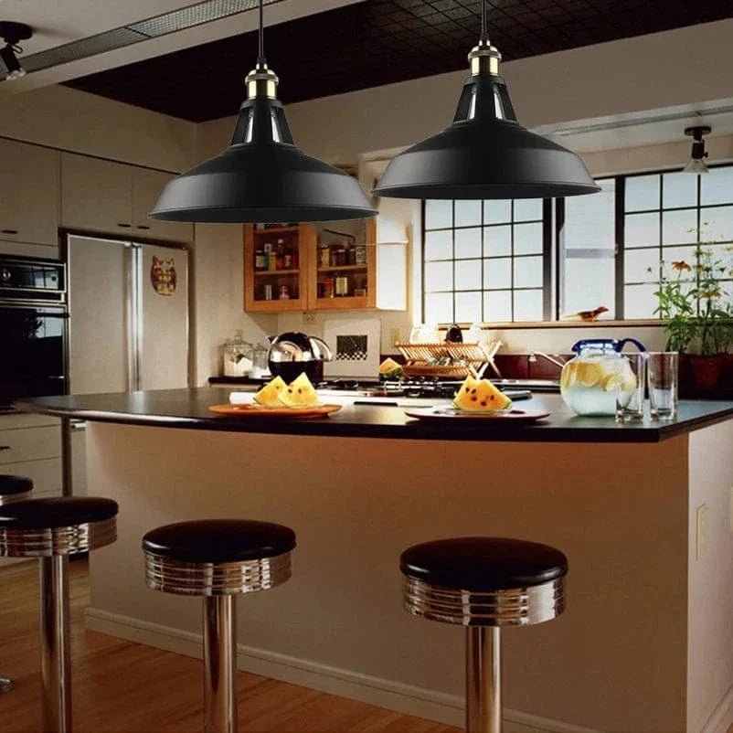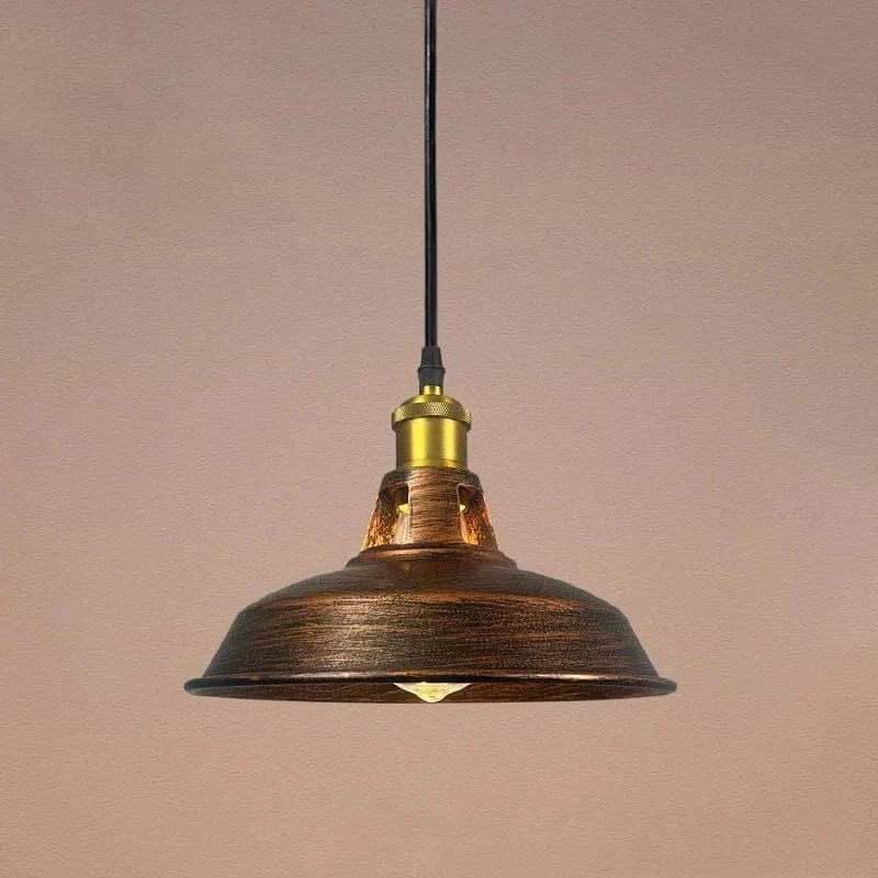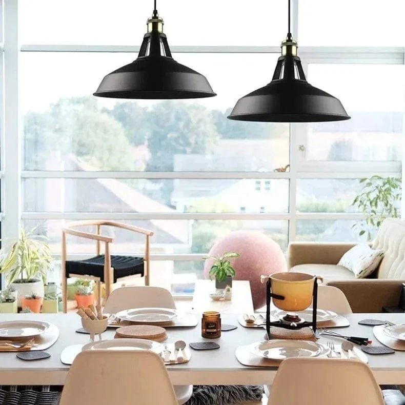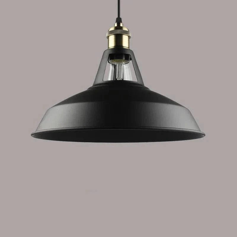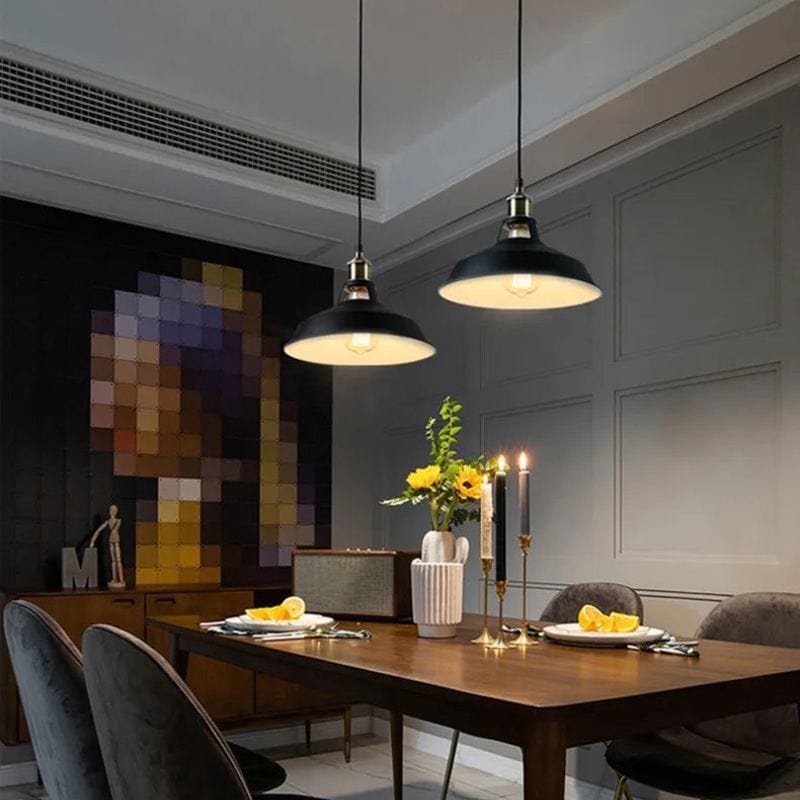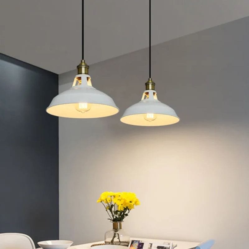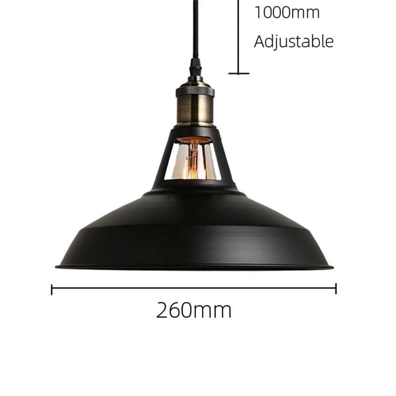 Denna stilrena taklampa i retrodesign kombinerar industriell charm med vintageelegans. Med sin breda metallskärm i svart eller vitt och mässingsdetaljer ger den ett varmt och behagligt ljus, perfekt för köket, matsalen eller caféet. Den öppna konstruktionen upptill låter ljuset spridas både uppåt och nedåt, vilket skapar en mysig atmosfär. Passar utmärkt med en dekorativ Edison-glödlampa för en ännu mer autentisk retrolook. Enkel att installera och justerbar i höjd för att passa olika utrymmen.