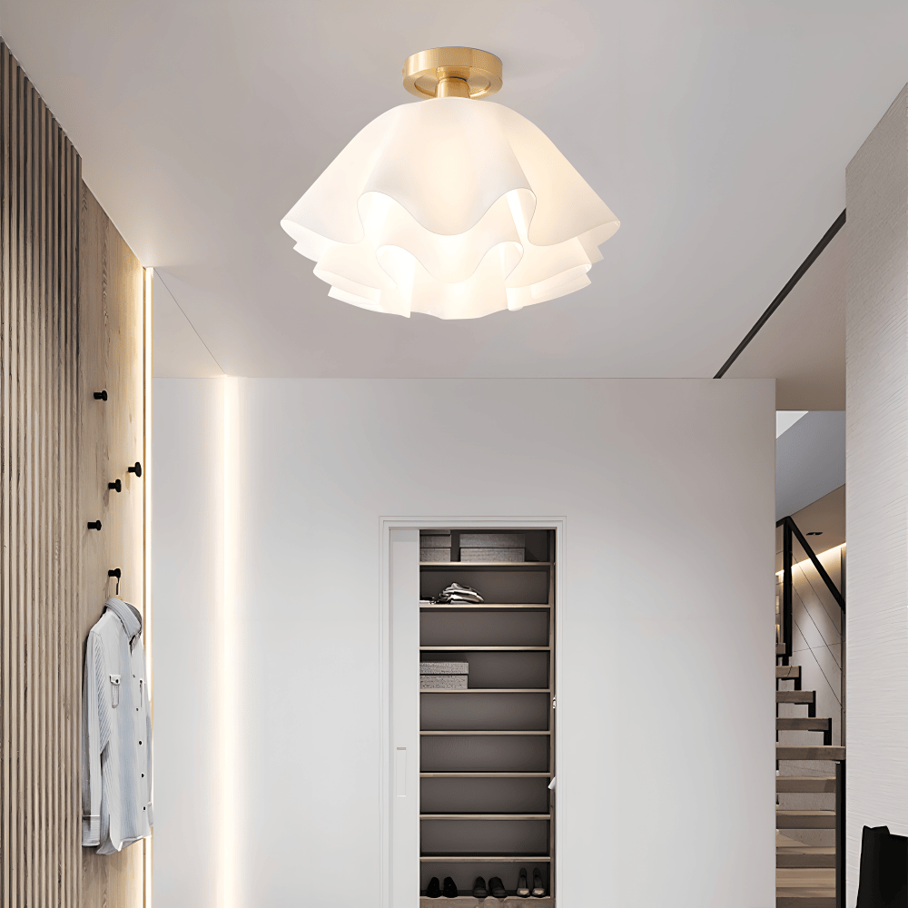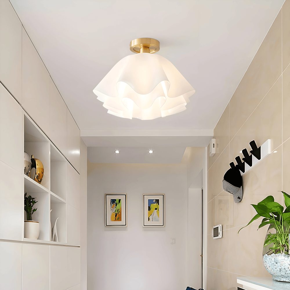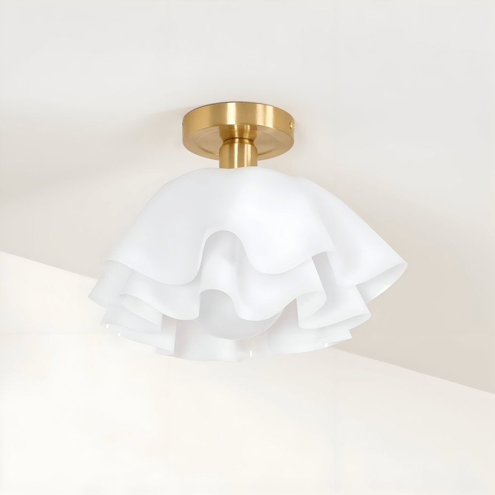 Designen på denna taklampa hämtar sin kraft från naturens geometri. De vita kronbladen i akryl är noga placerade för att bygga upp en fyllig, rund form som ser olika ut från varje vinkel. Akrylmaterialet är valt för sin fantastiska förmåga att leda och sprida ljus, samtidigt som det ger lampan en lätt vikt som gör monteringen enkel. Den matta, vita finishen gör att lampan känns fräsch och modern, och den fungerar lika bra som ett diskret inslag i en ljus inredning som en mjuk kontrast i ett rum med starkare färger.